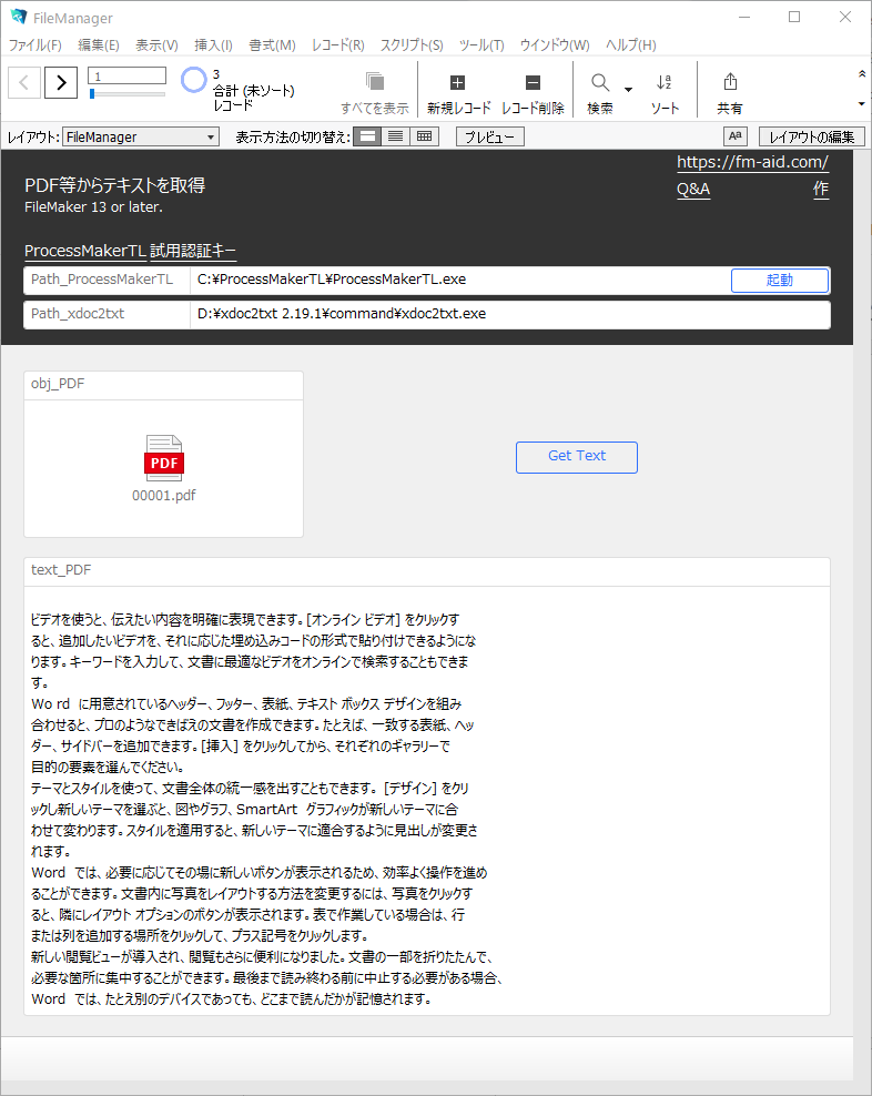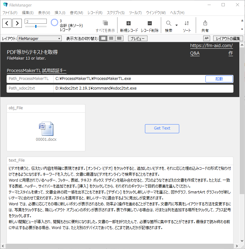 Filemaker プラグイン Windows専用 など Filemakerのフィールドにpdf Word Excel 一太郎などのテキストを抽出保存
